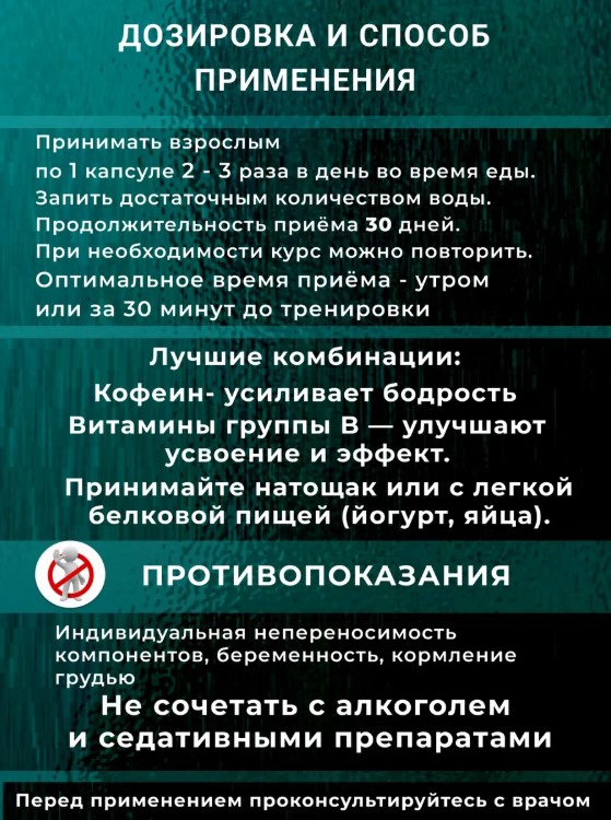 • Улучшение физической производительности: Способствует повышению выносливости и снижению усталости во время тренировок.