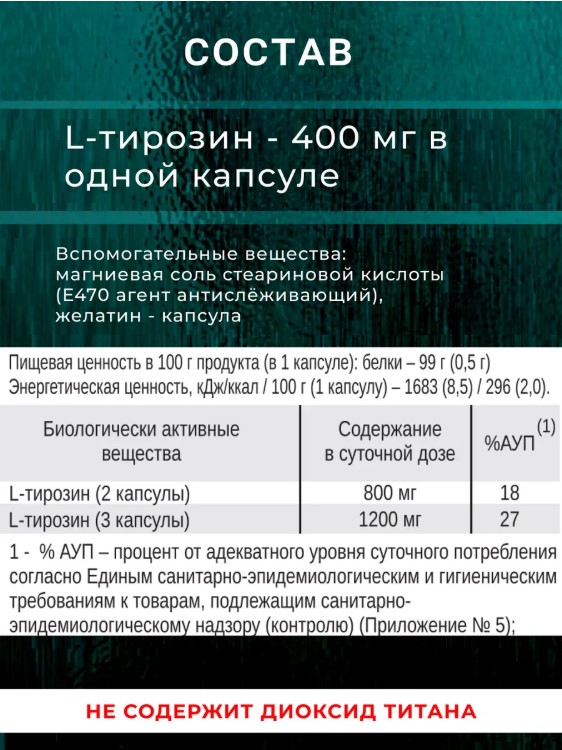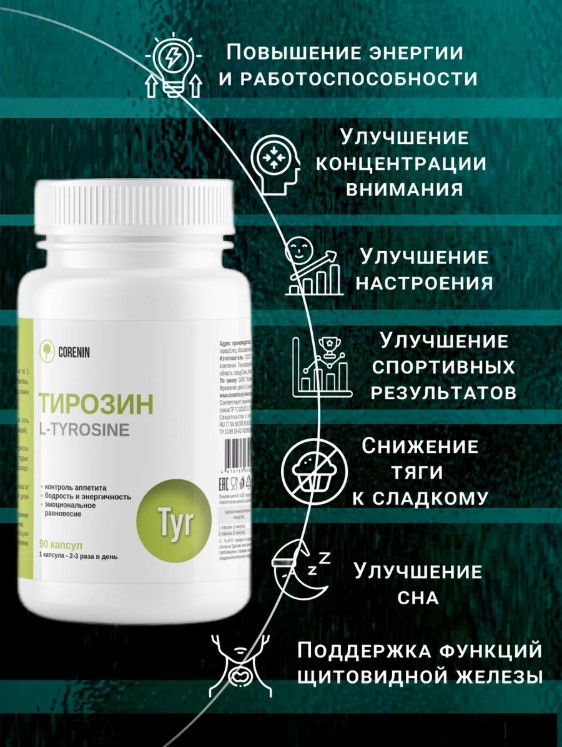 • Поддержка умственной активности: L-тирозин способствует улучшению когнитивных функций и концентрации внимания.
