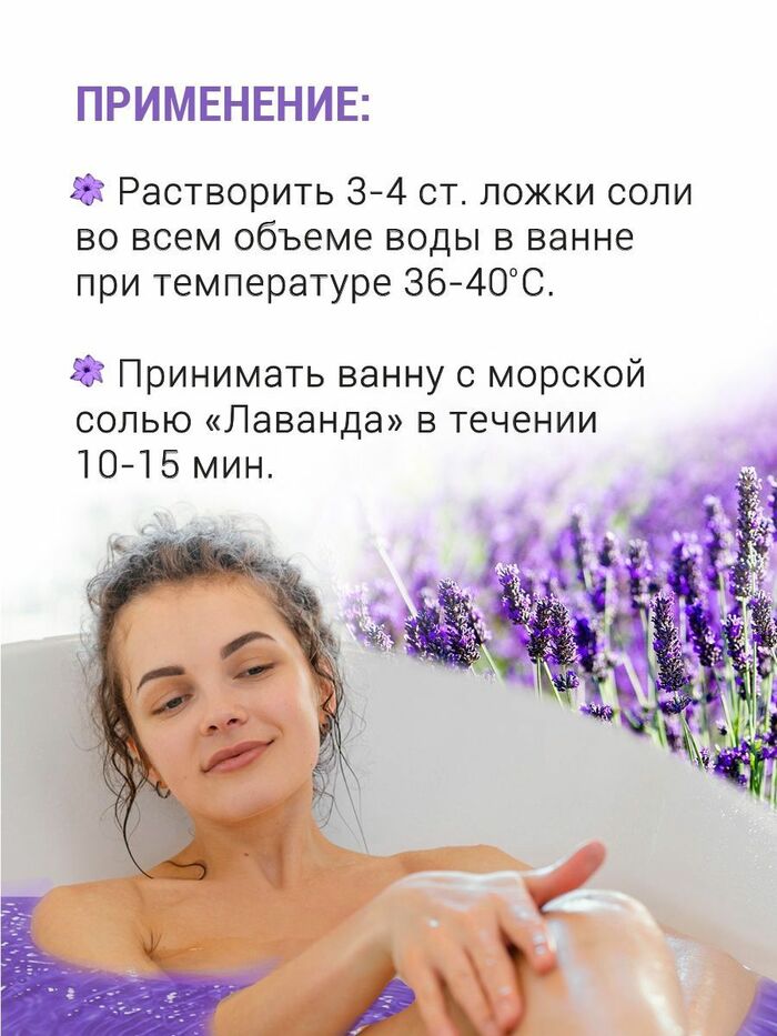 Растворить необходимое количество соли в теплой воде во время наполнения ванны. Использовать для ванн или душа по назначению.