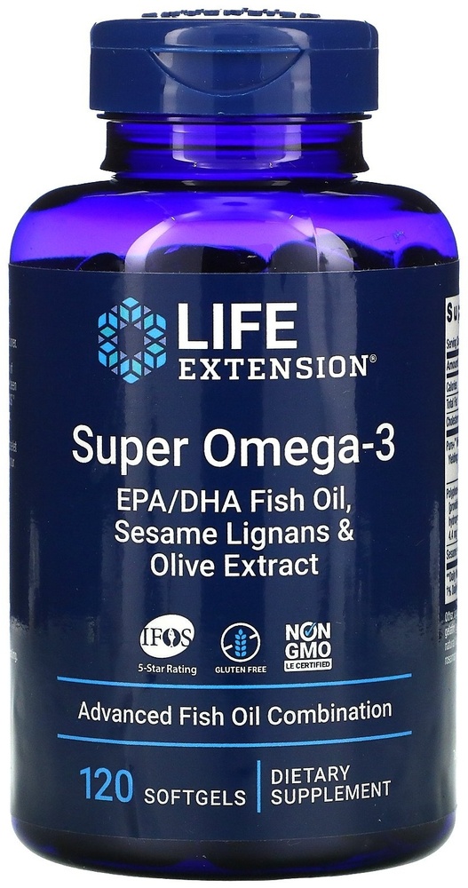 Life Extension Омега-3 Супер ЭПК/ДГК Рыбий жир с лигнанами кунжута и экстрактом оливы, 120 капсул