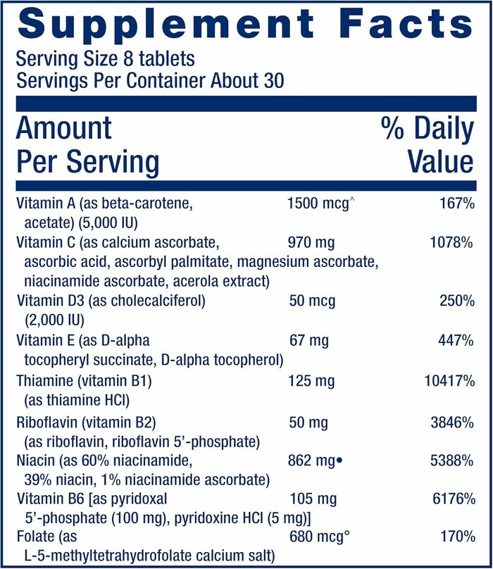 Могут возникнуть временное покраснение, зуд, сыпь или расстройства желудка. При приеме ниацина в дозе более 500 мг в день рекомендуется проверка функции печени. Людям с подагрой или заболеваниями печени следует избегать приема высоких доз ниацина. Проконсультируйтесь с врачом перед использованием этого продукта, если вы принимаете антикоагулянты. Лицам, потребляющим более 50 мкг (2000 МЕ) витамина D в день (из рациона и добавок), следует периодически измерять уровень 25-гидрокси витамина D в сыворотке крови. Добавки с витамином D не рекомендуется принимать людям с высоким уровнем кальция в крови. Людям с врожденными нарушениями метаболизма меди (например, страдающим болезнью Вильсона) следует избегать ежедневного регулярного употребления этого продукта.
