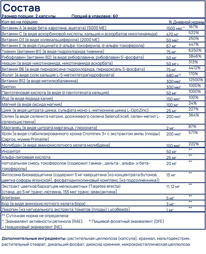Продукт содержит биоактивную форму фолиевой кислоты (5-МТГФ), кверцетин в фитосомной форме для повышенной биодоступности, цинк в виде цитрата, витамин E в виде смешанных токоферолов, и другие ингредиенты. Добавка также включает лютеин и зеаксантин, которые поддерживают здоровье глаз и помогают бороться с окислительным стрессом. Альфа-липоевая кислота, селен и апигенин дополнительно поддерживают защиту от окислительного стресса, здоровый обмен веществ и иммунную функцию.
