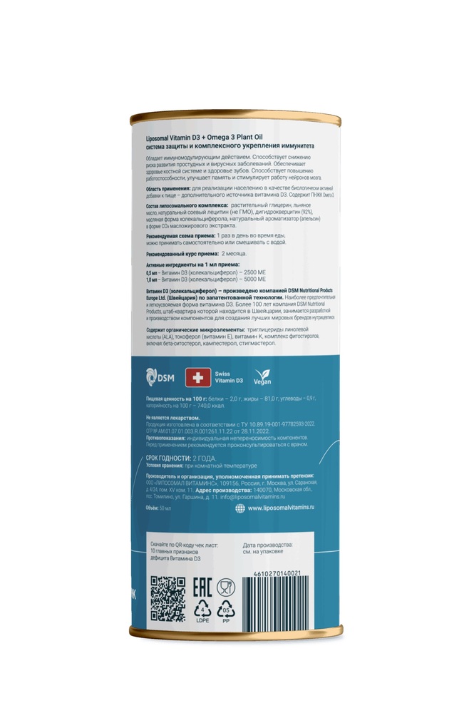 Липосомальный Витамин Д3 + Омега 3 от бренда Liposomal Vitamins — это высококачественный продукт, который обеспечивает ваш организм необходимыми питательными веществами. В каждой упаковке содержится 50 мл эффективной формулы, которая поддерживает здоровье и активность.