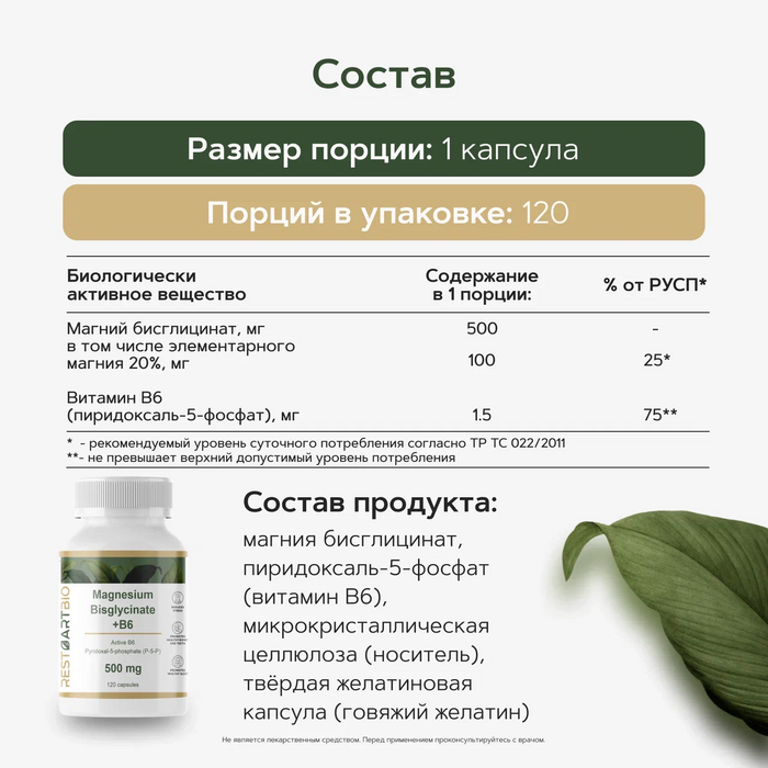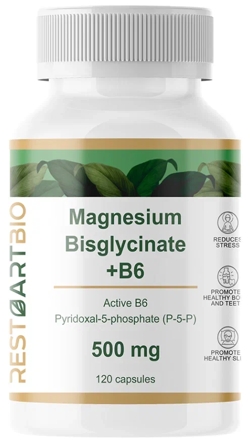 Магний бисглицинат (500 мг) с витамином В6 (р-5-р) от бренда RestartBio — это высококачественная добавка, которая поддерживает здоровье и нормальное функционирование организма. В каждой упаковке содержится 120 капсул, что обеспечивает длительный курс приема.