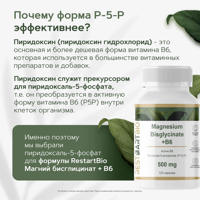 RestartBio Магний цитрат (650 мг) + витамин В6 (р-5-р), 120 капсул