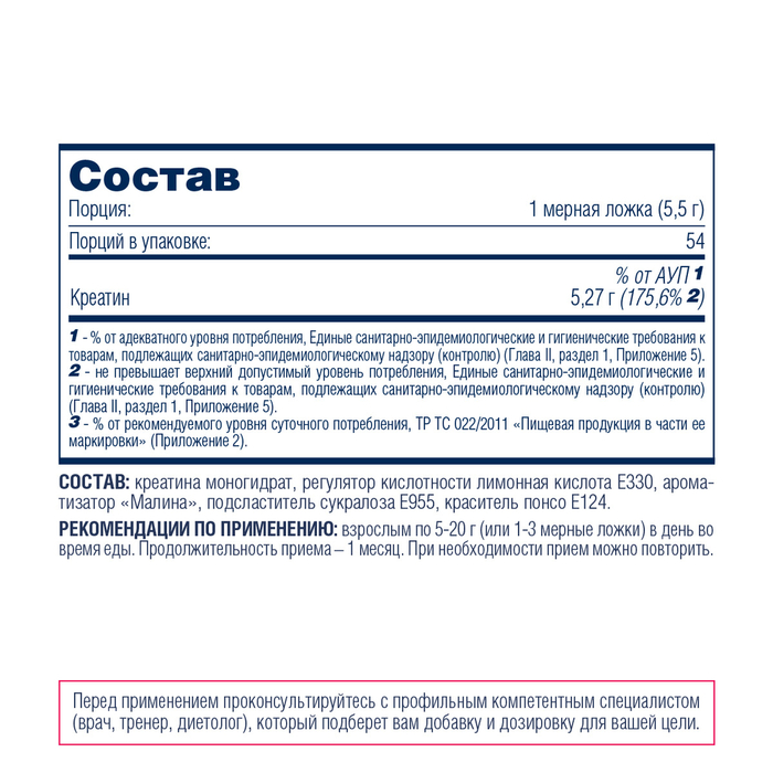 Существуют 2 способа приема креатина: С фазой загрузки: первые 5 дней рекомендуется принимать 1 порцию (5,5 грамм), растворенную в воде или соке, 3-4 раза в день (всего 15-20 грамм в день). Затем, на фазе поддержания, принимать 1 порцию (5,5 грамм), растворенную в воде или соке, 1 раз в день. Без фазы загрузки: принимать 1 порцию креатина (5,5 грамм), растворенную в соке или воде, 1 раз в день в течение, как минимум, 1 месяца.