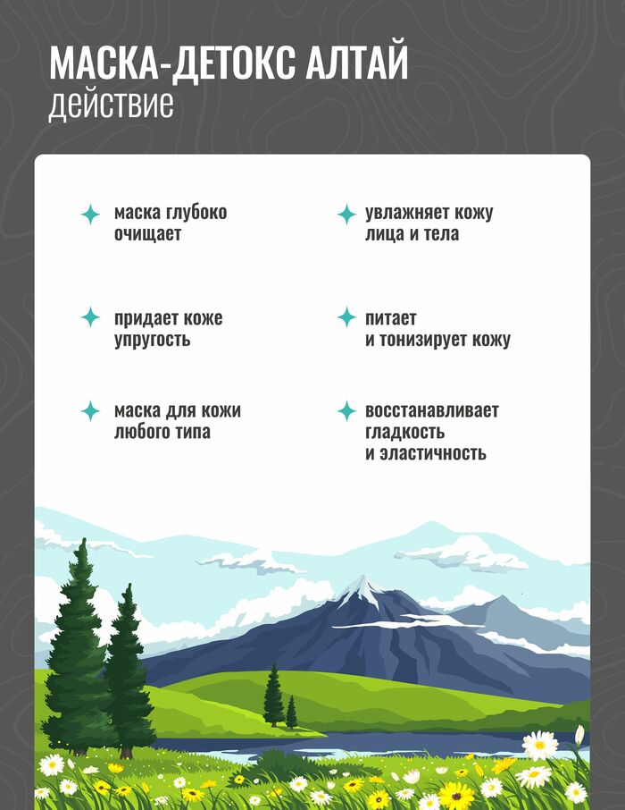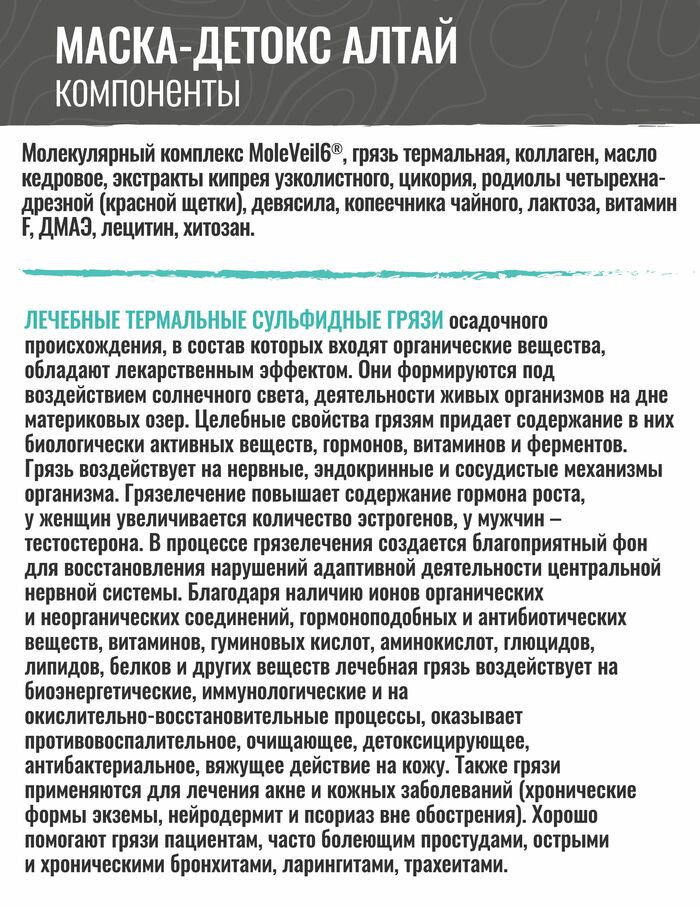 Маска-детокс «Алтай» грязевая для кожи любого типа. Предназначена для профессионального применения.Грязевая косметическая маска глубоко очищает, увлажняет, питает и тонизирует кожу. Уникальное сочетание сульфидных грязей и растительных экстрактов растений Алтая придает коже упругость, восстанавливает гладкость и эластичность.Маска прошла клинические испытания.Если во время эксплуатации у Вас возникли вопросы,мы ответим на них. Маска-детокс «Алтай» грязевая-отличный выбор для Ваших волос!