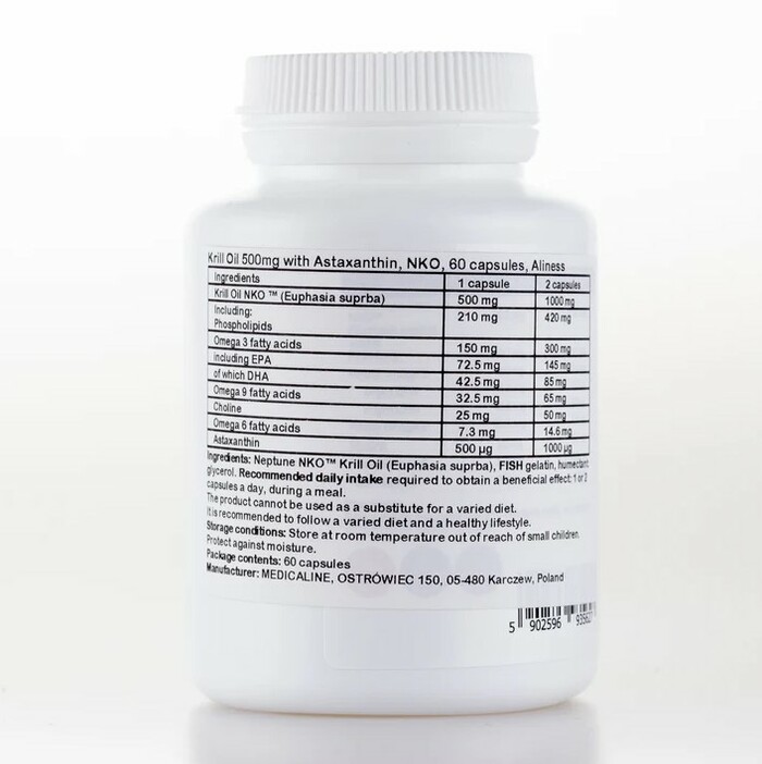 Масло криля Aliness Omega 3 NKO — это высококачественный источник омега-3 жирных кислот, который поддерживает здоровье сердечно-сосудистой системы и улучшает общее состояние организма. В каждой упаковке содержится 60 капсул, каждая из которых содержит 500 мг масла криля.