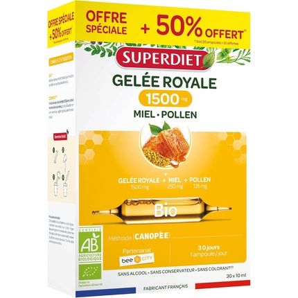 Superdiet Маточное молочко SUPERDIET Royal Jelly 1500 мг с медом и пыльцой Био, 20 ампул по 15 мл