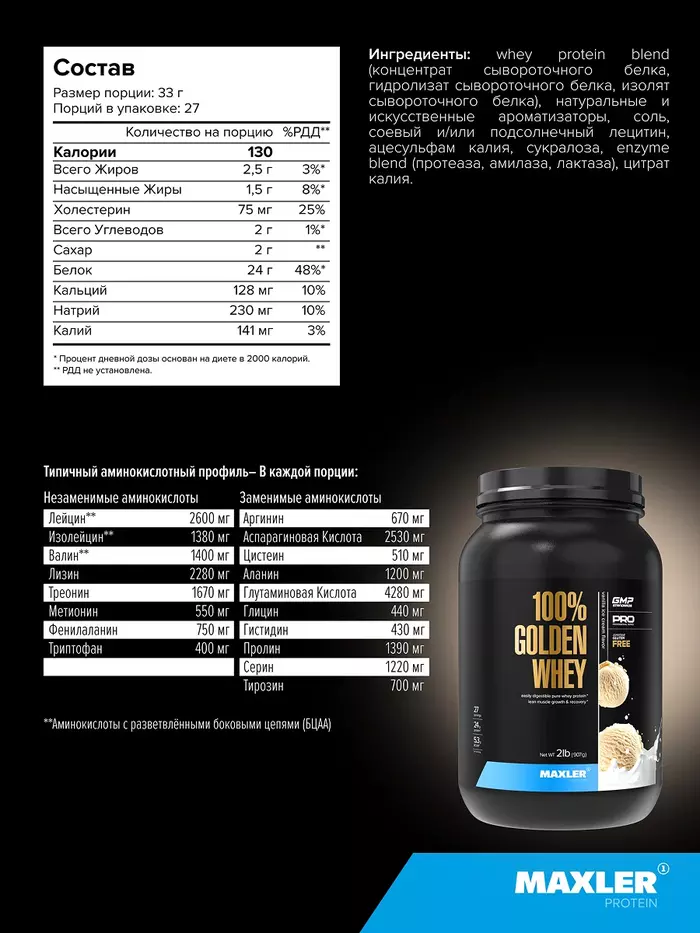- Высокое содержание белка: Содержит 100% чистый концентрат, изолят и гидролизат сывороточного протеина, которые быстро усваиваются организмом, обеспечивая мышцы необходимыми аминокислотами.