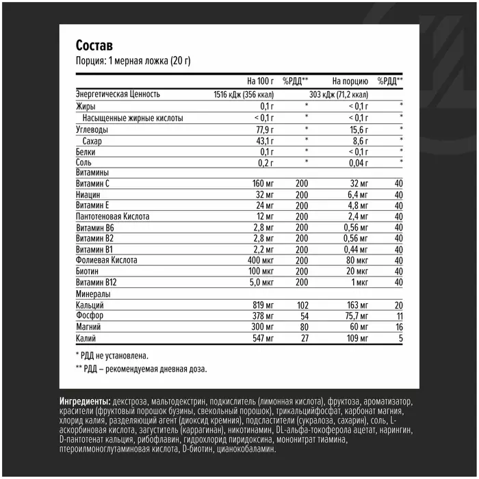 Для получения одной порции смешать 20 г (1 мерную ложку) с 500 мл воды. Рекомендуется принимать до и во время нагрузки.
