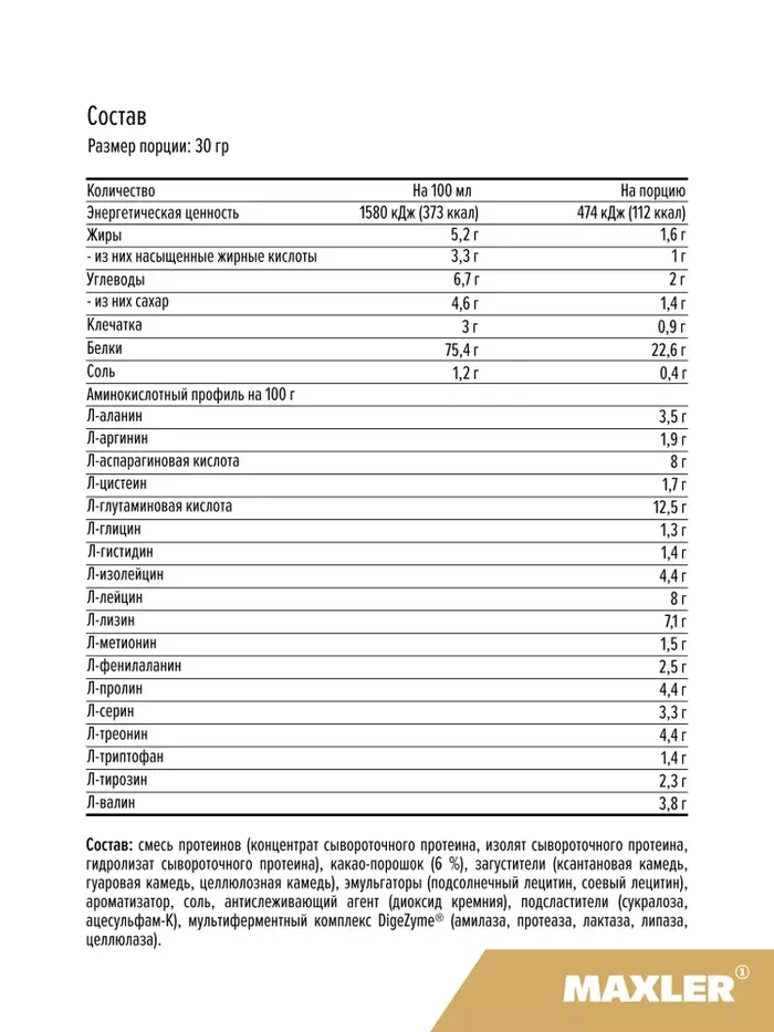 Смешайте 1 порцию (30 г) с 250 мл воды или молока.