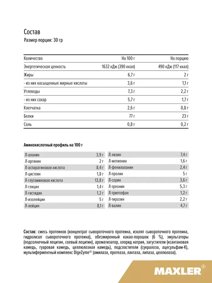 Смешайте 1 порцию (30 г) с 250 мл воды или молока.
