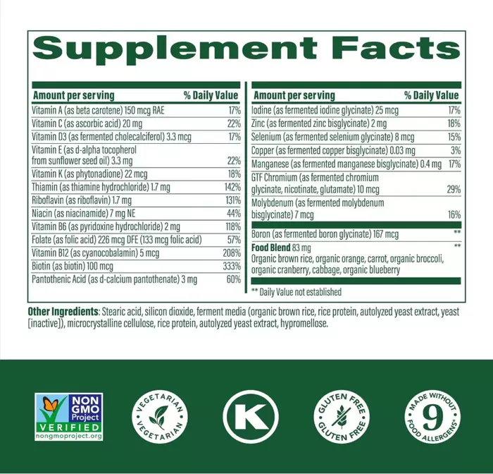 ИнгредиентыСтеариновая кислота, диоксид кремния, ферментированная среда (органический коричневый рис, рисовый протеин, автолизированный экстракт дрожжей, дрожжи [неактивные]), микрокристаллическая целлюлоза, рисовый протеин, автолизированный экстракт дрожжей, гипромеллоза.