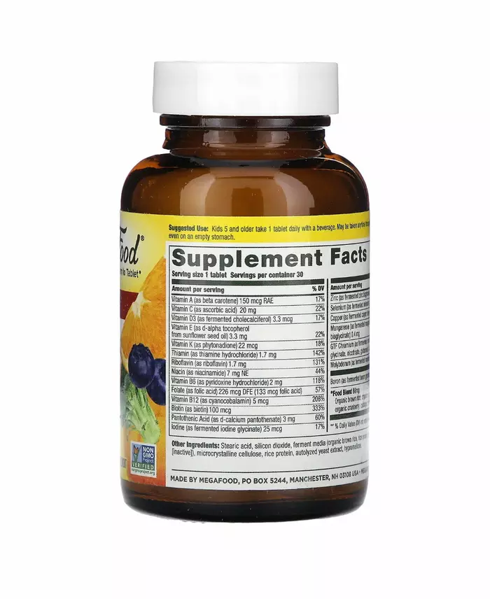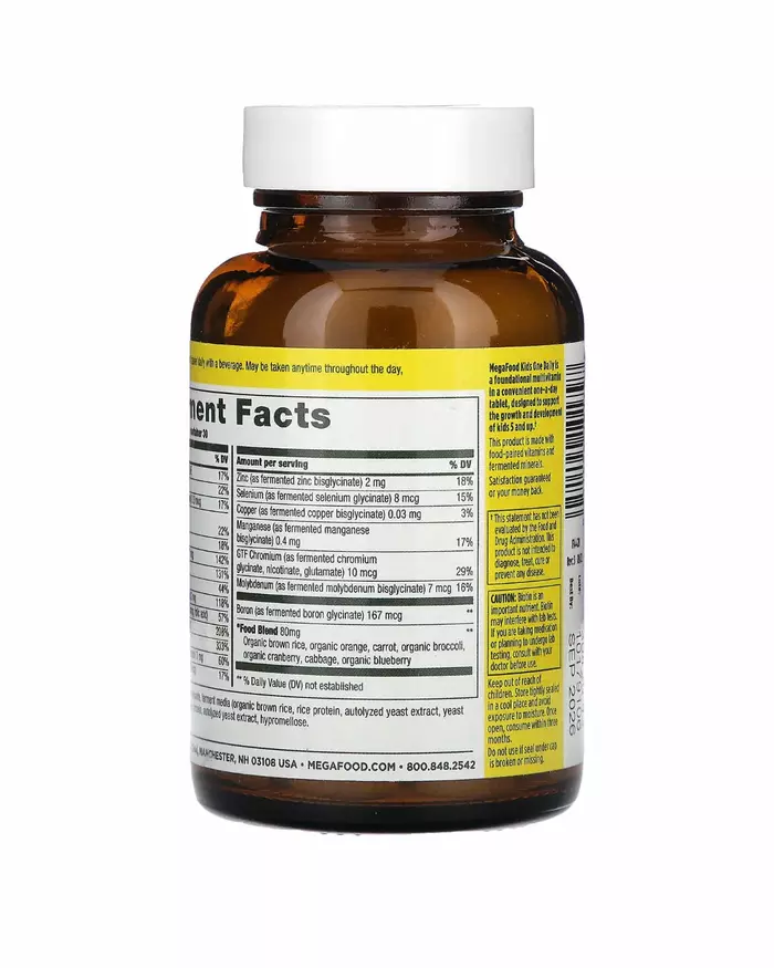 MegaFood Kids One Daily — это базовый мультивитаминный комплекс в удобных таблетках для приема один раз в день, разработанный для роста и развития детей старше 5 лет.