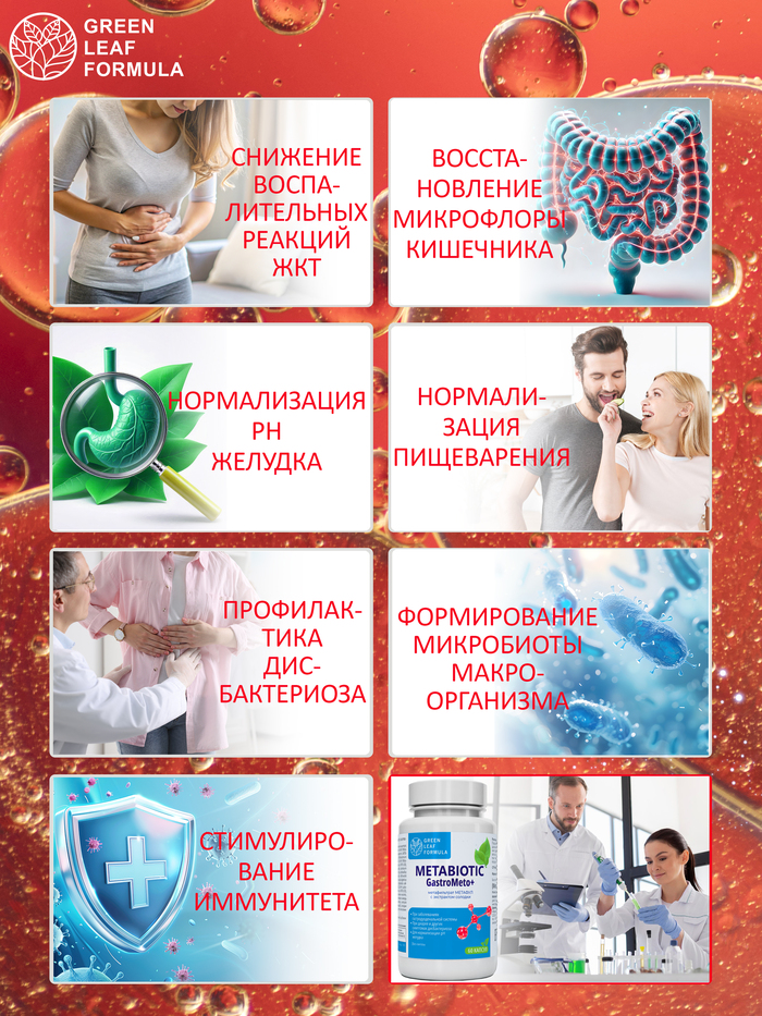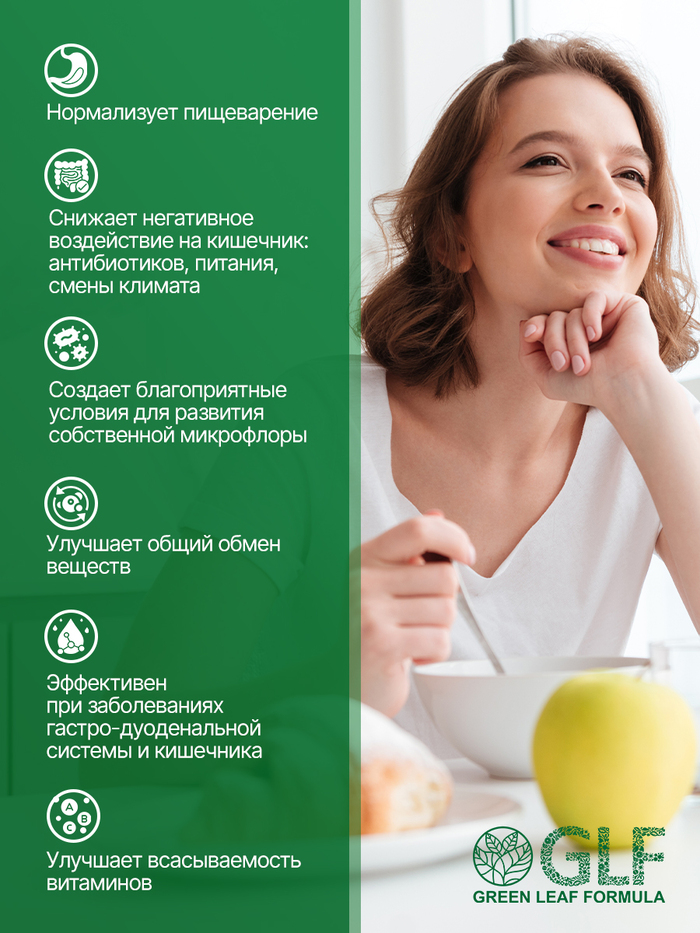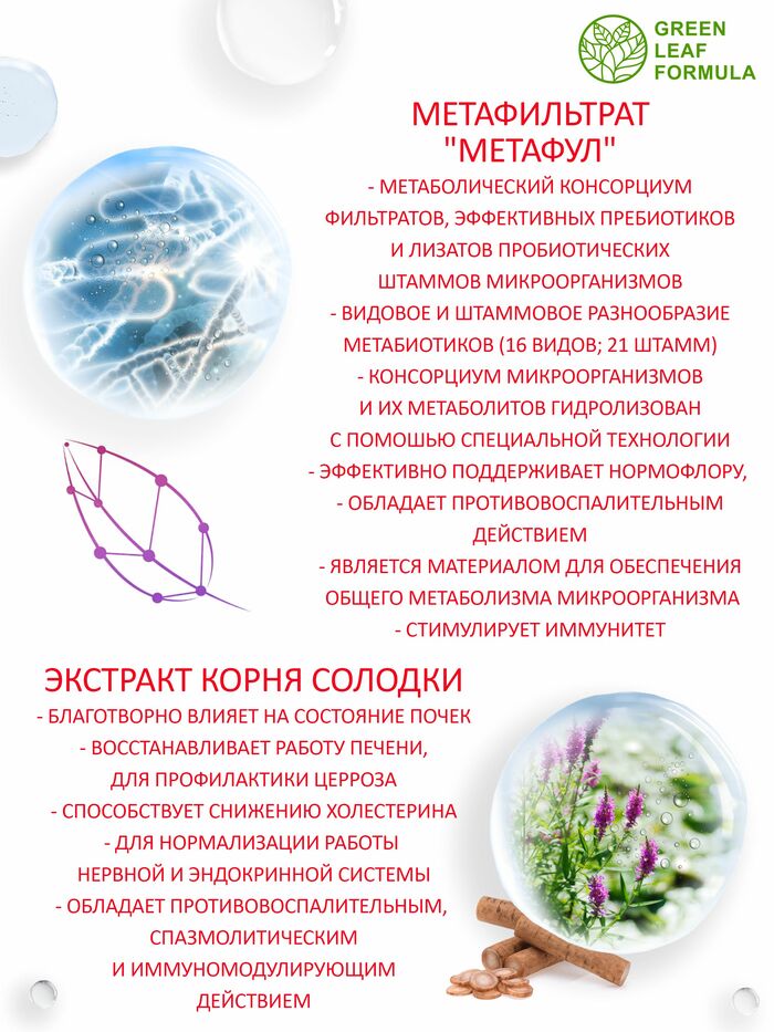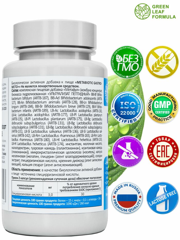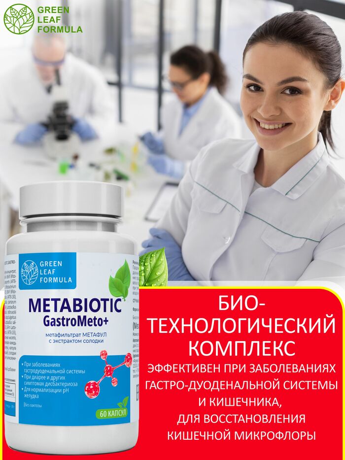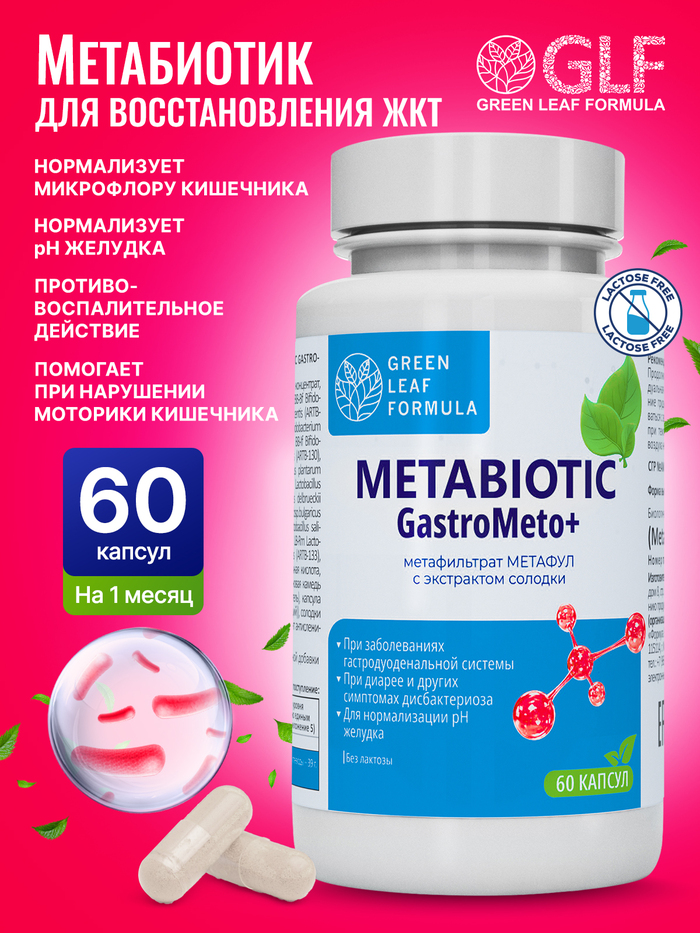 Метабиотик для восстановления кишечной микрофлоры от бренда GREEN LEAF FORMULA — это эффективное средство для поддержания здоровья вашего кишечника. В каждой упаковке содержится 60 капсул, которые помогут восстановить баланс микрофлоры и улучшить пищеварение.