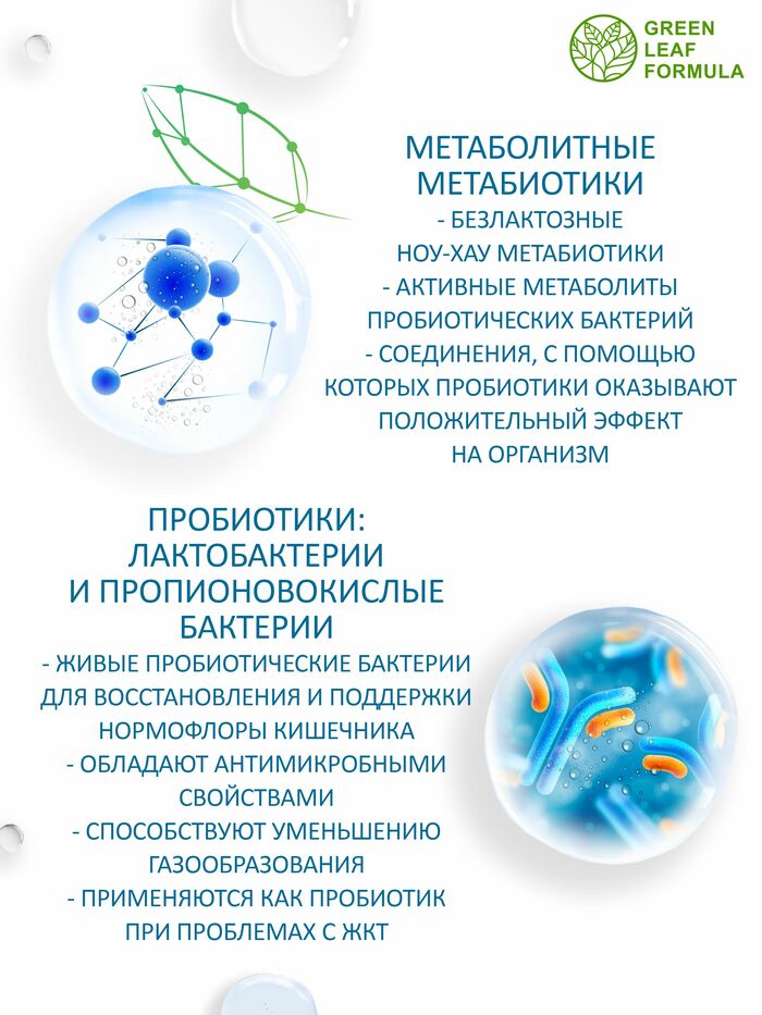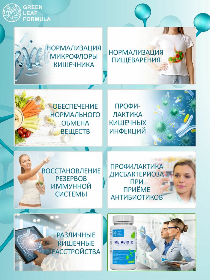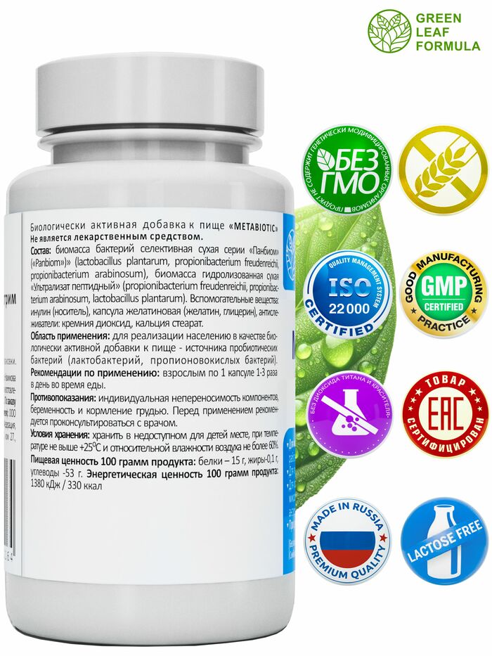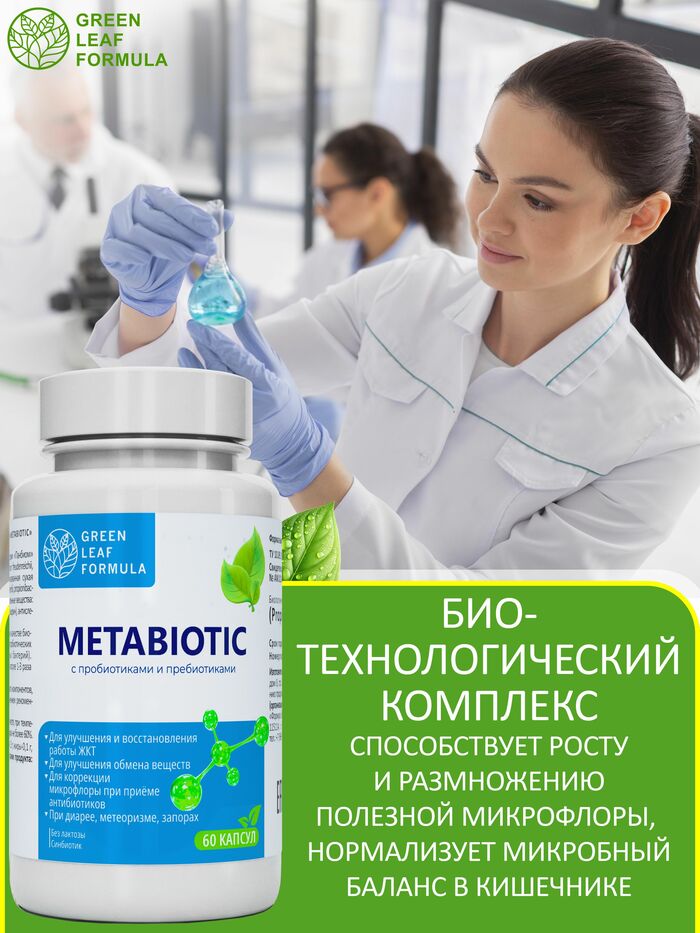 Метабиотик с пробиотиками и пребиотиками от бренда GREEN LEAF FORMULA — это высококачественный продукт, который поддерживает здоровье кишечной флоры и способствует нормализации пищеварения. В каждой упаковке содержится 60 капсул, что обеспечивает длительный курс приема.