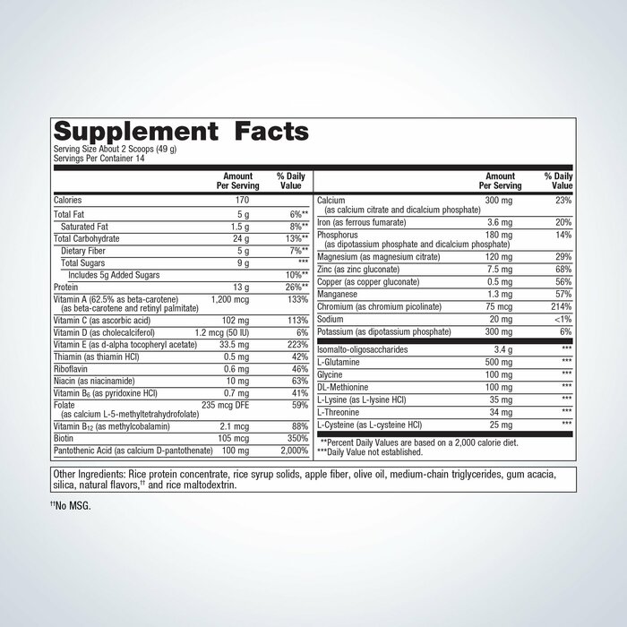 Ингредиентыконцентрат рисового протеина, сухая рисовая патока, яблочная клетчатка, оливковое масло, среднецепочечные триглицериды, аравийская камедь, диоксид кремния, натуральные ароматизаторы и рисовый мальтодекстрин.