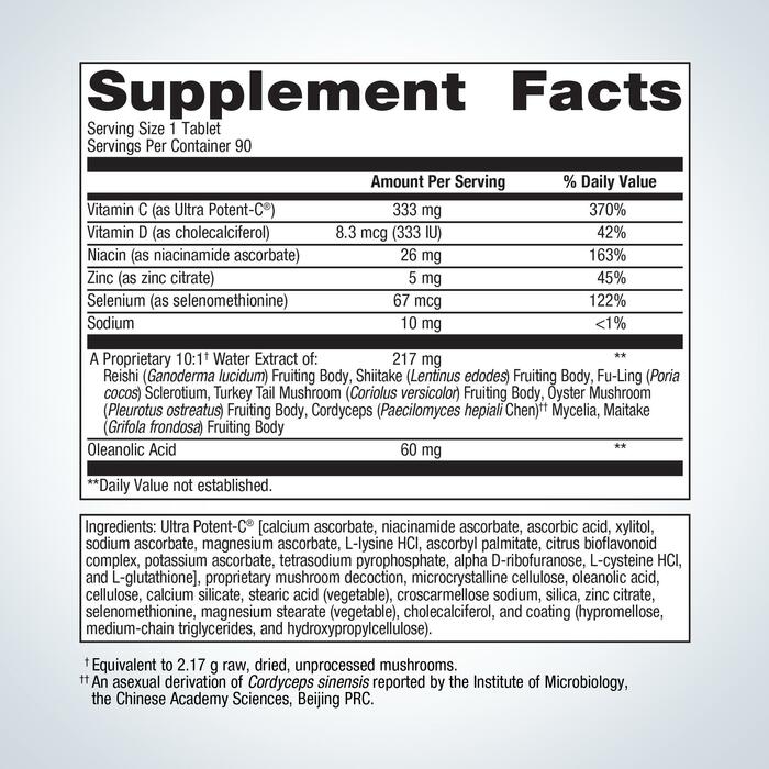 Ultra Potent-C® [аскорбат кальция, аскорбат ниацинамида, аскорбиновая кислота, ксилитол, аскорбат натрия, аскорбат магния, L-лизин гидрохлорид, аскорбил пальмитат, цитрусовый биофлавоноидный комплекс, аскорбат калия, тетранатрия пирофосфат, альфа D-рибофураноза, L-цистеин гидрохлорид, и L-глутатион], запатентованный грибной отвар, микрокристаллическая целлюлоза, олеаноловая кислота, целлюлоза, силикат кальция, стеариновая кислота (растительного происхождения), кроскармеллоза натрия, диоксид кремния, цитрат цинка, селенометионин, стеарат магния (растительного происхождения), холекальциферол, и покрытие (гипромеллоза, среднецепочечные триглицериды, гидроксипропилцеллюлоза).