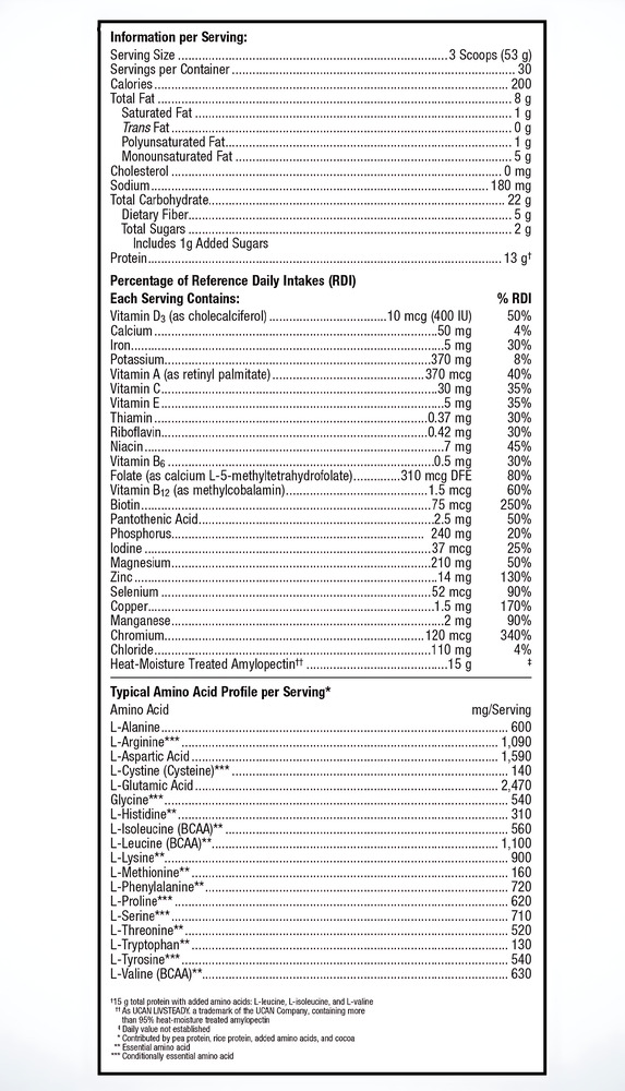 ИнгредиентыАмилопектин, прошедший термообработку, изолят горохового белка, оливковое масло, концентрат рисового белка, аравийская камедь, овсяная шелуха, цитрат магния, диоксид кремния, натуральные ароматизаторы, ^ L-лейцин, Порошок из коры китайской корицы, гуаровая камедь, L-изолейцин, L-валин, ксантановая камедь, смесь витаминов и минералов (глюконат цинка, аскорбиновая кислота, глюконат марганца, d-альфа токоферилацетат, глюконат меди, D-биотин, ретинилпальмитат, никотинамид, холекальциферол, кальция D-пантотенат, пиколинат хрома, пиридоксина гидрохлорид, рибофлавин, йодид калия, тиамина гидрохлорид, кальция L-5-метилтетрагидрофолат, селенометионин, и метилкобаламин), экстракт плодов монаха (Luo Han Guo).
