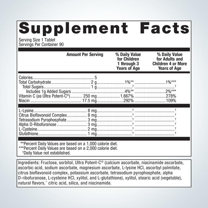 Жевательные таблетки Ultra Potent-C® - это запатентованная формула, которая нежно воздействует на желудок и хорошо переносится в высоких дозах. Наш витамин C был научно разработан для улучшения усвоения витамина C лейкоцитами, жизненно важной частью вашей иммунной системы, по сравнению с аскорбиновой кислотой. Одна таблетка с прекрасным вкусом содержит столько же витамина С, сколько четыре апельсина.