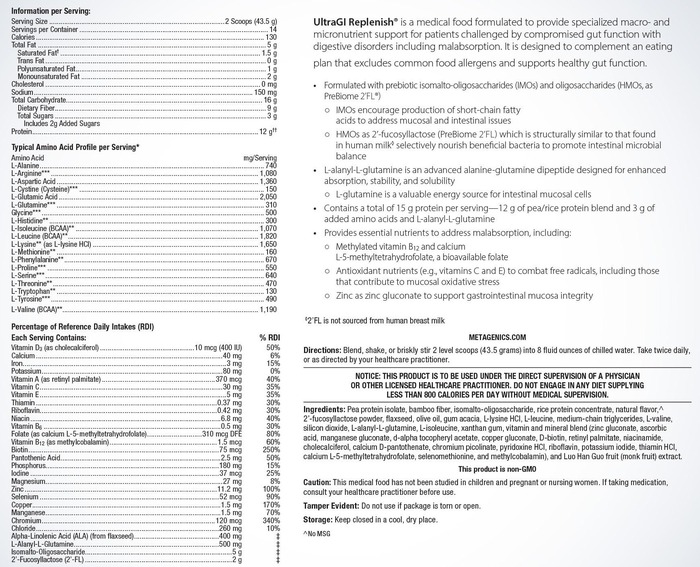 UltraGl Replenish® - это медицинская пища, разработанная для обеспечения специализированной макро- и микронутриентной поддержки для пациентов с нарушенной функцией кишечника с нарушениями пищеварения, включая мальабсорбцию. Он разработан в качестве дополнения к рациону, исключающему распространенные пищевые аллергены и поддерживающему здоровую работу кишечника.