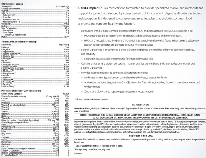 UltraGl Replenish® - это медицинская пища, разработанная для обеспечения специализированной макро- и микронутриентной поддержки для пациентов с нарушенной функцией кишечника с нарушениями пищеварения, включая мальабсорбцию. Он разработан в качестве дополнения к рациону, исключающему распространенные пищевые аллергены и поддерживающему здоровую работу кишечника.