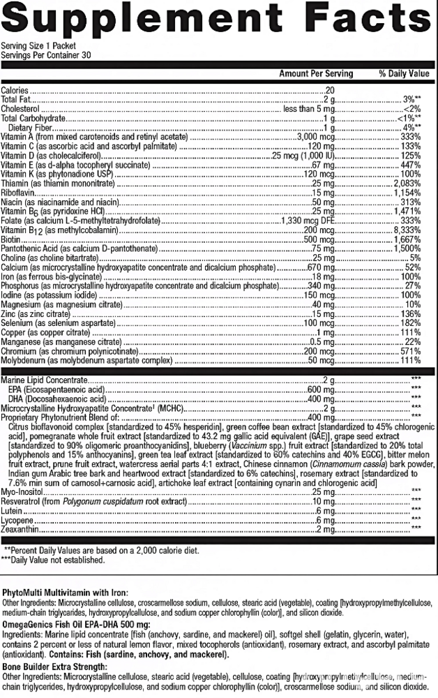 ИнгредиентыPhytoMulti: Микрокристаллическая целлюлоза, кроскармеллоза натрия, целлюлоза, стеариновая кислота (растительного происхождения), диоксид кремния, и покрытие [гипромеллоза, среднецепочечные триглицериды, гидроксипропилцеллюлоза, и натрий-медный хлорофиллин (краситель)].