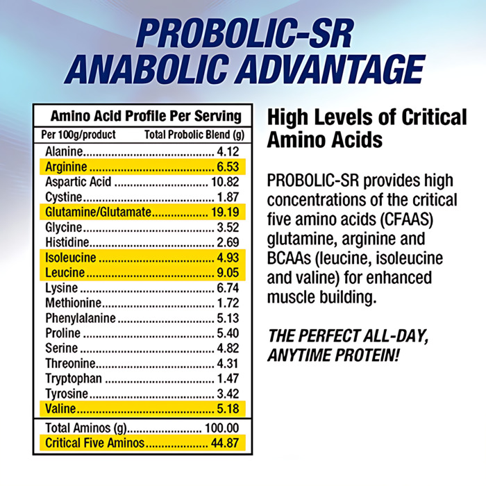 Уникальная протеиновая смесь PROBOlic-SR, эксклюзивная технология микродобавки с замедленным высвобождением и высокие концентрации пяти критически важных аминокислот (CFAAS) — глутамина, аргинина и аминокислот с разветвленной цепью (лейцин, изолейцин и валин) — все это основные достижения в области протеиновых добавок, предназначенные для усиления анаболических эффектов белка. PROBOlic-SR обеспечивает постоянное поступление наиболее важных аминокислот, которые помогают стимулировать мышечный рост, улучшать восстановление и снижать катаболизм+.