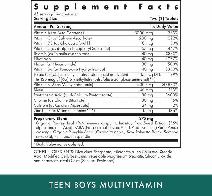 Ежедневная формула из трав и витаминов для мальчиков-подростков. Содержит травы, которые традиционно использовались мужчинами для поддержания здоровья. Идеально для физически активного подростка. Содержит Opti-Zinc® с холином, инозитолом и ниацином.