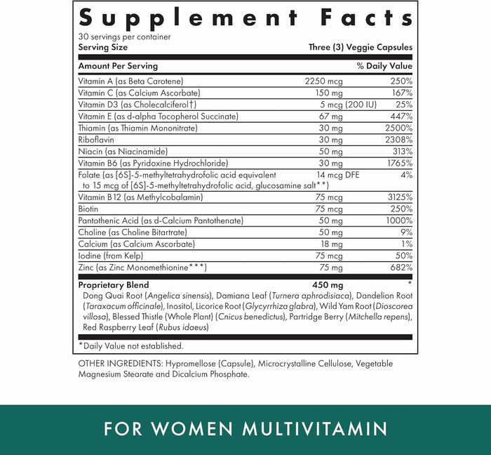 Ежедневная формула питательных веществ и трав для здорового женского организма. Содержит травы, которые традиционно использовались женщинами для поддержания здоровья. Высокие дозы витаминов группы B, включая пантотеновую кислоту, для энергии и выносливости. Холин, инозитол и ниацин для метаболизма холестерина.