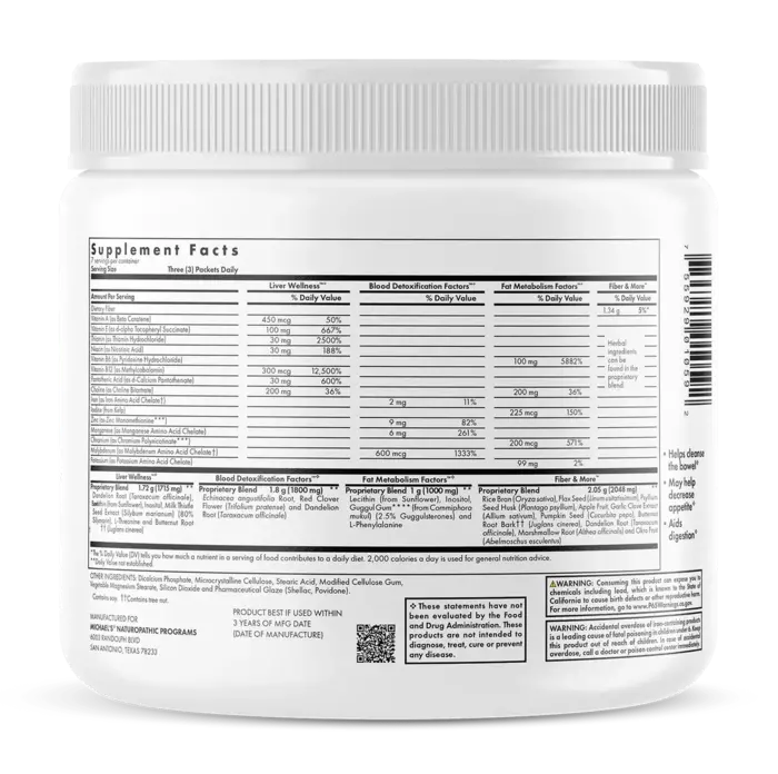 Принимать содержимое одного пакетика во время каждого приема пищи (3 пакетика в день). Следуйте этому графику в течение 7 дней. В течение всего времени использования программы Michael's® 1 Week Flush ™ пейте много воды (лучше всего не из-под крана). 8 стаканов и более в день. Также полезно увеличить потребление волокнистых фруктов и овощей, уменьшив при этом потребление обработанных пищевых продуктов, мяса и молочных продуктов.