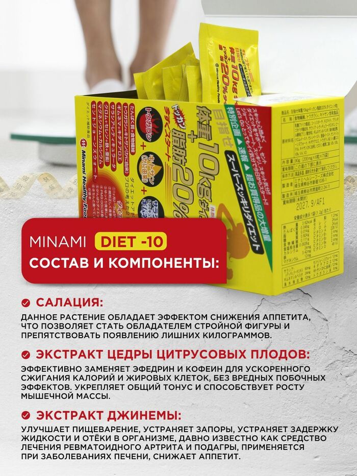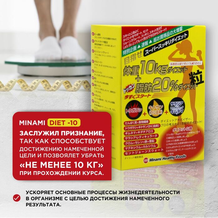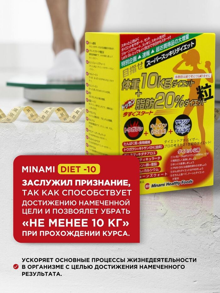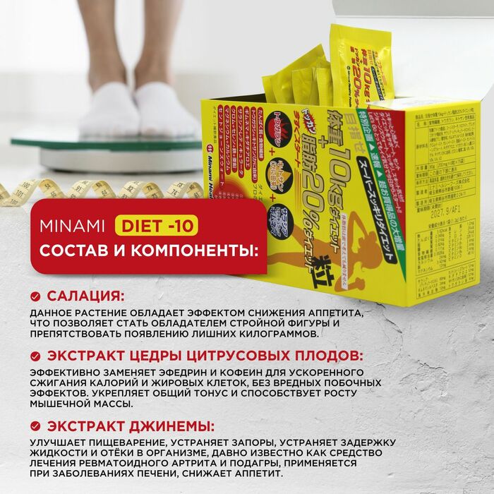 Minami Healthy Foods "ДИЕТА минус 10кг за курс" — это эффективный жиросжигатель для похудения, который поможет вам достичь желаемых результатов за 75 дней. Этот курс разработан для тех, кто стремится избавиться от лишнего веса и улучшить свою фигуру.