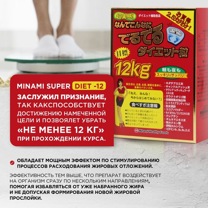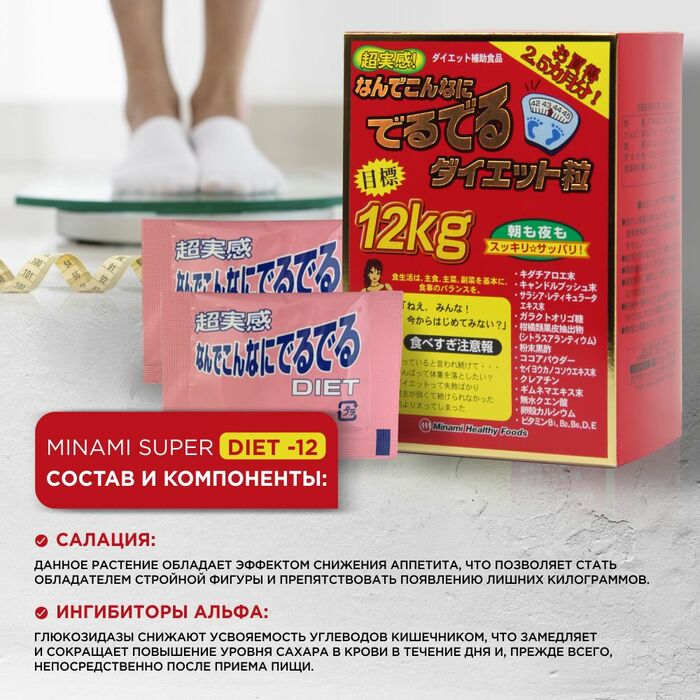 Пищевая добавка Супер Диета минус 12 кг от Minami Healthy Foods — это эффективное решение для тех, кто стремится к снижению веса. В каждой упаковке содержится 75 пакетиков, каждый из которых включает 6 таблеток, что обеспечивает удобство в использовании на протяжении 75 дней.