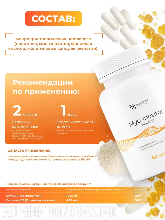 Мио-Инозитол NOVOAGE nutrition — это высококачественная добавка, содержащая 60 капсул, предназначенная для поддержки женского здоровья. Этот продукт помогает в регулировании обмена веществ и поддерживает нормальную функцию яичников.