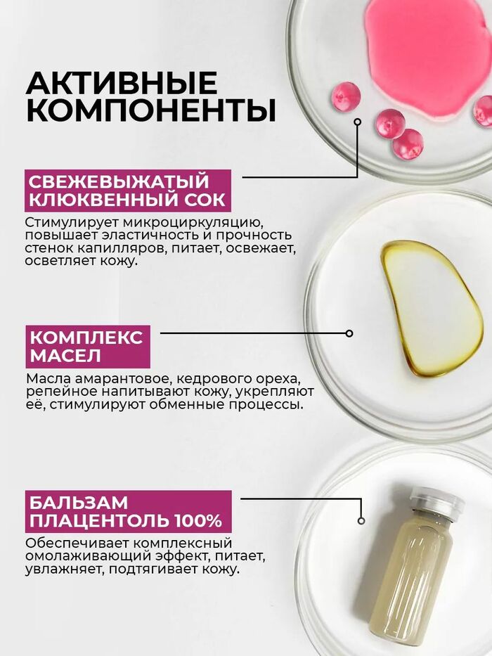 • Клюквенный сок: помогает поддерживать тонус кожи и улучшает общее впечатление от ухода.