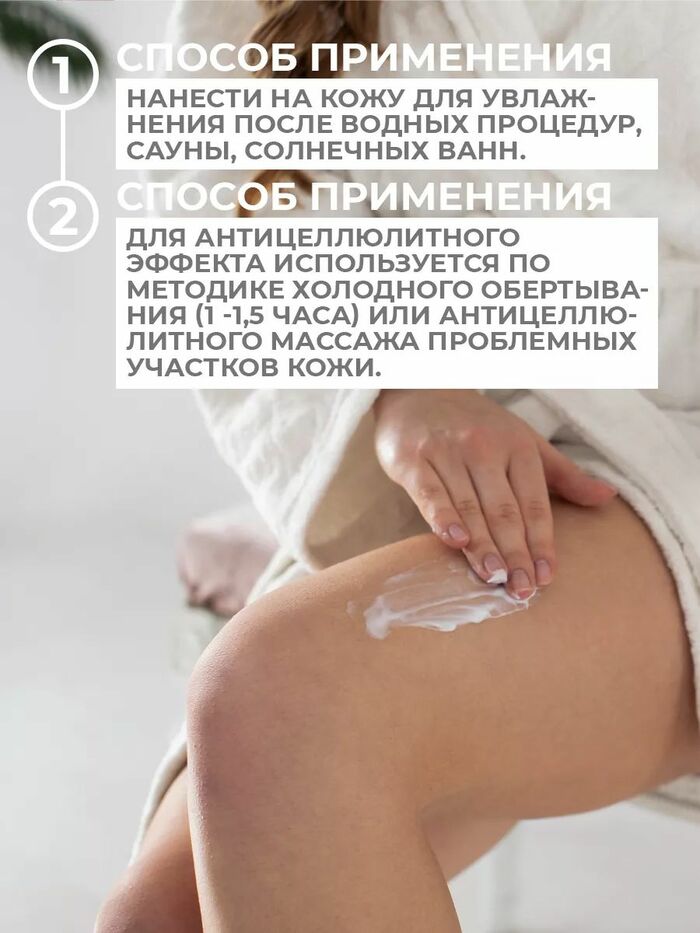 Для достижения антицеллюлитного эффекта используется по методике холодного обертывания (1 -1,5 часа) или антицеллюлитного массажа проблемных участков кожи (бедра, ягодицы, живот).