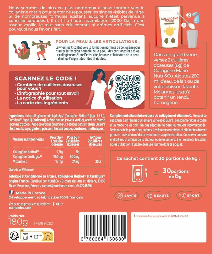 Морской коллаген Nutri&Co типов I, II, III с витамином C — это высококачественный продукт, который поддерживает здоровье кожи, суставов и волос. В каждой упаковке содержится 180 г коллагена, обогащенного витамином C, который способствует его усвоению.