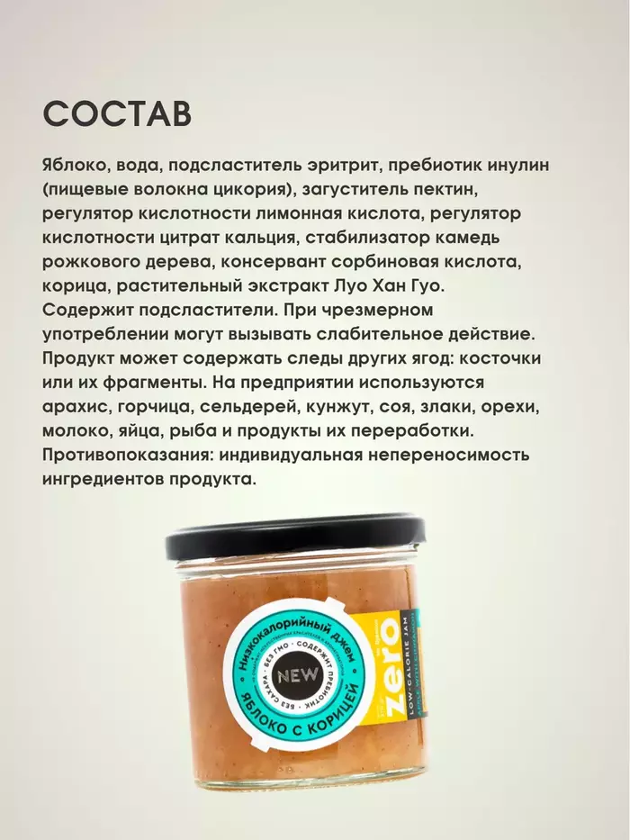 Джем Mr. Djemius «Яблоко с корицей» — это низкокалорийный и диетический джем, идеально подходящий для тех, кто следит за своим питанием и предпочитает полезные альтернативы традиционным десертам. Этот джем изготовлен без добавления сахара, вместо него используется натуральный подсластитель эритрит, который имеет нулевой гликемический индекс. В состав джема входят яблоко, вода, пребиотик инулин (пищевые волокна цикория), загуститель пектин и регулятор кислотности лимонная кислота, что обеспечивает ему нежную текстуру и среднюю плотность.