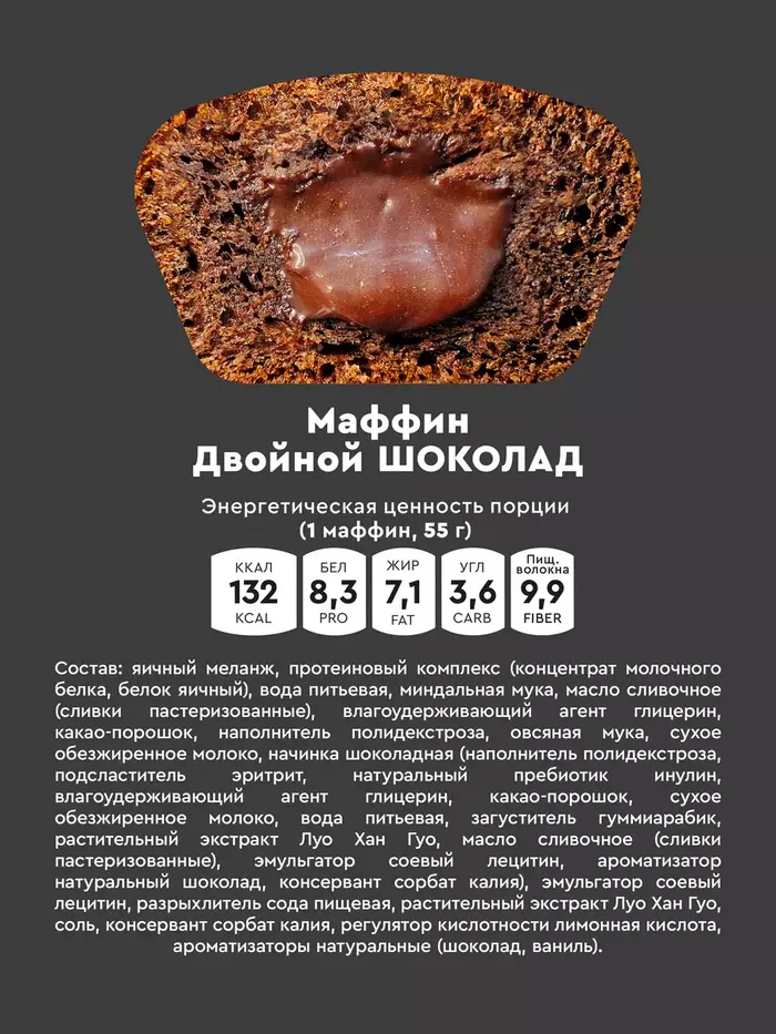 Одной из ключевых особенностей этого маффина является его состав, который включает протеиновый комплекс (концентрат молочного белка и яичный белок), меланж и полезные альтернативы пшеничной муке — миндальную и овсяную муку. Упаковка включает 8 маффинов по 55 г каждый, что обеспечивает удобный и компактный запас здорового питания. Маффин «Двойной шоколад» от Mr. Djemius Zero идеально подходит для чаепития или в качестве завершающего аккорда в конце полезной трапезы.