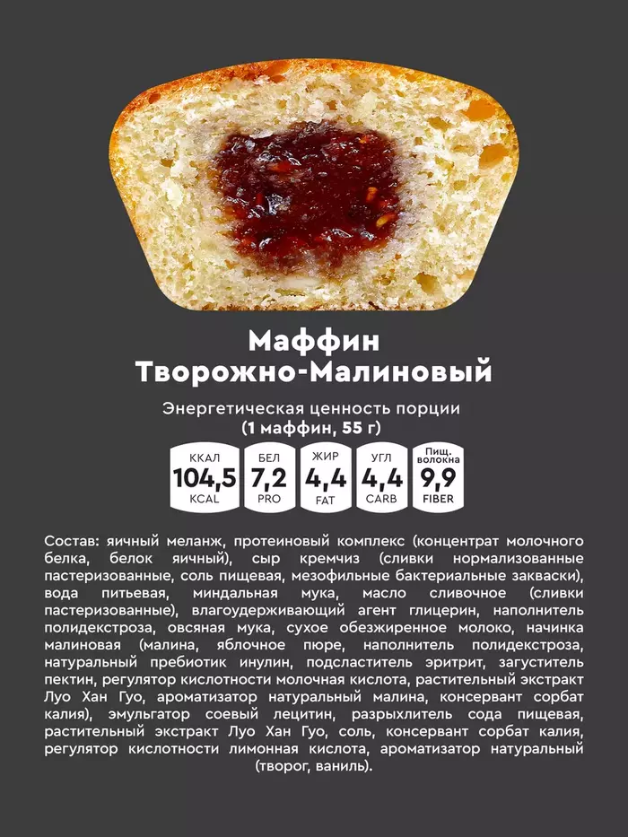 Маффин Mr. Djemius «Творожный с малиновой начинкой» — это уникальный и полезный протеиновый десерт, идеально подходящий для тех, кто следит за своим питанием и хочет вести здоровый образ жизни. Этот маффин изготовлен без сахара, вместо которого используется натуральный экстракт тропического растения Луо Хан Гуо, который не вызывает скачков уровня сахара в крови и не содержит калорий. Нежная текстура творога в сочетании с сочной малиновой начинкой делает этот маффин не только полезным, но и очень вкусным.