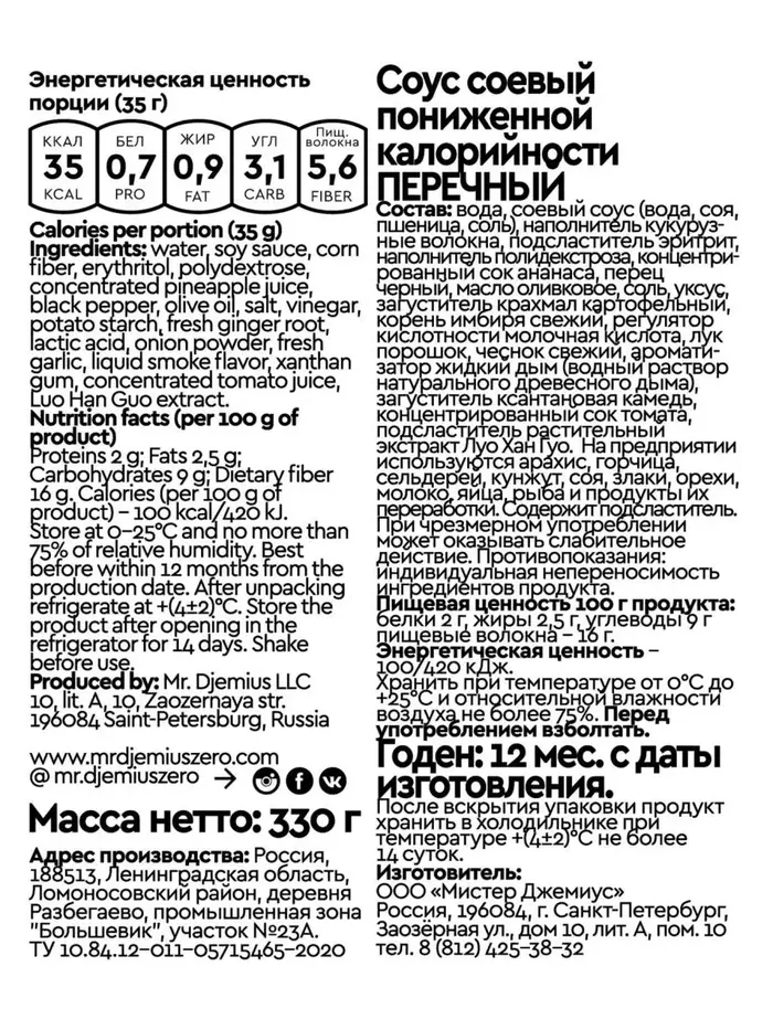 Mr. Djemius Соус соевый пониженной калорийности Перечный, 330 г