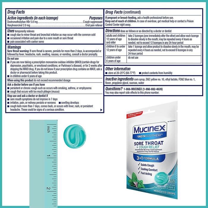| Дети от 6 до 12 лет | Возьмите 1 пастилку и дайте продукту медленно раствориться во рту; можно повторять каждые 4 часа по мере необходимости, но не более 6 пастилок в течение 24 часов.