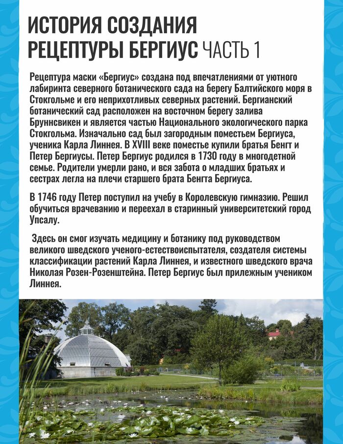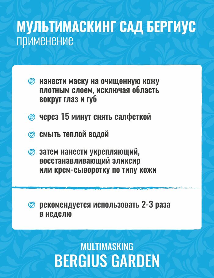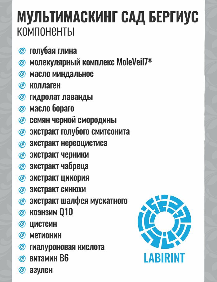 Голубая кремовая биомаска «Bergius Garden» с голубой глиной, нереоцистисом и черникой для ухода за Т-зоной (лоб, нос) подходит комбинированному и нормальному типу кожи. Молекулярная маска с ботаническим названием предназначена для очищения пор, нормализации липидного баланса, подтяжки кожи и ее легкого матирования.Сад Бергиуса, расположенный в Национальном парке Стокгольма, знаменит большим количеством представителей флоры, собранных со всех уголков мира, а также обилием лекарственных растений. Голубая маска не даром носит такое название, ведь в ее состав входит не только молекулярный комплекс, но и большое количество масел и экстрактов трав, ягод и минерала смитсонит, призванных вылечить кожу и избавить ее от проблем различной этиологии.Голубая глина обладает интенсивным антибактериальным воздействием, избавляя кожу от воспалений и высыпаний, устраняет дискомфорт и успокаивает боль, которую они причиняют, а также несет в себе профилактическую функцию. Это вещество глубоко очищает поры, устраняет черные точки и нормализует деятельность сальных желез. Подтягивает кожу, насыщает полезными микроэлементами, борется с пигментацией.Аналогичные функции имеет и экстракт черники, который способствует очищению пор и их сужению, оказывает противовоспалительный эффект и омолаживает кожу. Черника также укрепляет стенки капилляров, являясь помощником в борьбе против купероза.Масло бораго направлено на возрождение истощенной, возрастной кожи. Оно обладает мощными антивозрастными и регенерирующими свойствами, восстанавливает водно-жировой баланс и эффективно снимает воспаления.Экстракт нереоцистиса стимулирует выработку коллагена. Увлажняет и защищает кожу от вредного воздействия факторов внешней среды.Биомаска «Сад Бергиус» – лечебный минерально-витаминный коктейль для проблемной кожи!