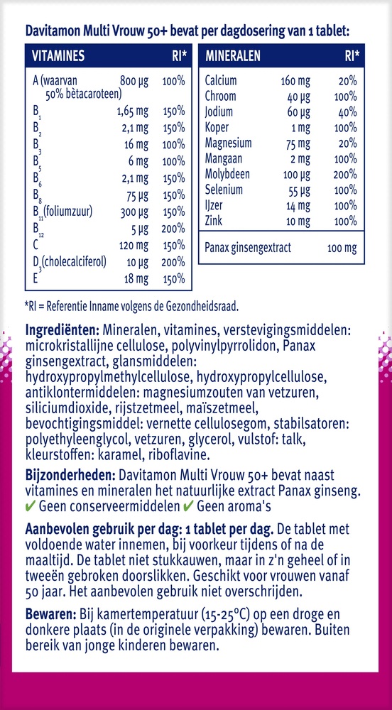 Мультивитамины Davitamon Multi Woman 50+ — это идеальное решение для поддержания здоровья женщин старше 50 лет. В каждой упаковке содержится 30 жевательных пастилок с приятным вкусом, которые обеспечат ваш организм необходимыми витаминами и минералами.