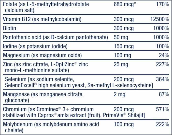 Формула для приема дважды в день теперь содержит 400 мкг 5-метилтетрагидрофолата (5-МТГФ), формы фолата, в семь раз более биодоступной, чем фолиевая кислота. Это особенно важно для людей с определенными унаследованными вариантами ферментов, которые снижают эффективность метаболизма фолиевой кислоты, поскольку 5-MTHF уже находится в метаболически активной форме.