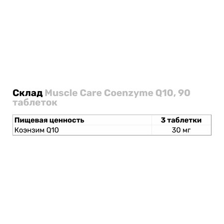 Muscle Care Coenzyme Q10 90 tab — это спортивная добавка, которая обеспечивает поступление в организм коэнзима Q10.  Коэнзим представляет собой витаминоподобное соединение, которое производится в печени. Этот элемент принимает участие в различных метаболических процессах, которые происходят в организме, он стимулирует производство АТФ — единственного энергетического источника.