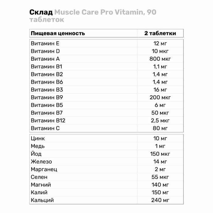 Muscle Care Pro Vitamin 90 таб — это комплексная витаминная добавка, разработанная специально для людей, ведущих активный образ жизни и занимающихся спортом. Продукт содержит широкий спектр витаминов, необходимых для поддержания общего здоровья, улучшения обмена веществ и повышения энергетического уровня. В состав входят такие важные витамины, как A, C, E, B-группы, а также минералы и растительные экстракты, которые способствуют лучшему усвоению и максимальной эффективности.