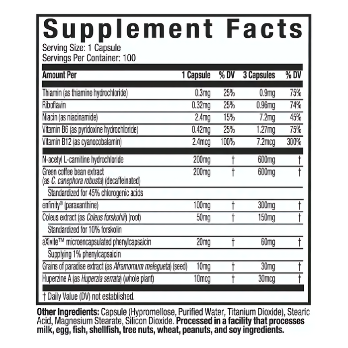 Продукт предназначен только для взрослых. Не используйте, если вы беременны, кормите грудью, страдаете сердечными расстройствами, артериальным давлением, нарушениями сна, тревожными расстройствами или язвой желудка. Проконсультируйтесь с врачом перед использованием, если вы проходили лечение, диагностировали или имеете семейный анамнез какого-либо заболевания, а также если вы принимаете какие-либо рецептурные или безрецептурные препараты, а также перед началом любой диеты или физических упражнений программа. Параксантин в одной порции этого продукта эквивалентен количеству, обычно метаболизируемому из более чем 1 чашки кофе. Не сочетайте с другими стимуляторами, включая кофеин. Прием следует прекратить за две недели до планируемой хирургической операции. Хранить в недоступном для детей месте.
