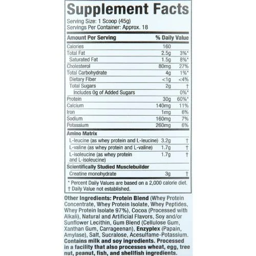Протеиновая смесь (концентрат сывороточного протеина, изолят сывороточного протеина, сывороточные пептиды, сывороточный изолят 97%), какао (обработанное щелочью), натуральные и искусственные ароматизаторы, лецитин из сои и/или подсолнечника, смесь камеди (целлюлозная камедь, ксантановая камедь, каррагинан), enzyplex (папаин, амилаза), соль, сукралоза, ацесульфам калия.